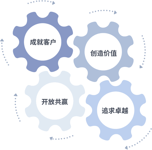 成就客户是一切决策的出发点,,创造价值是衡量所有工作的标准,,,追求卓越是我们做事做人的态度,,,开放共赢是我们的格局也是最终的结果。。。。价值观的齿轮环环相扣,,,,推动着组织里的每个人不断向前。。。
